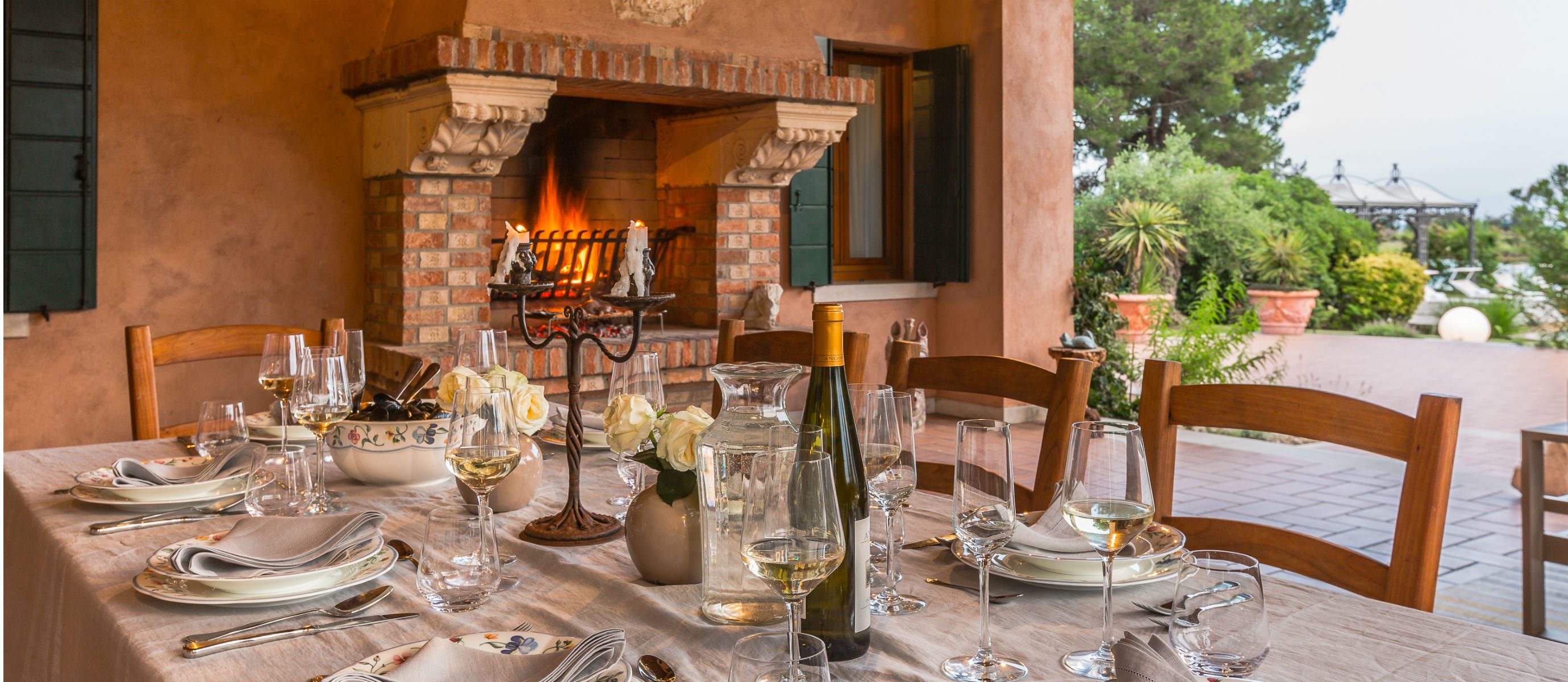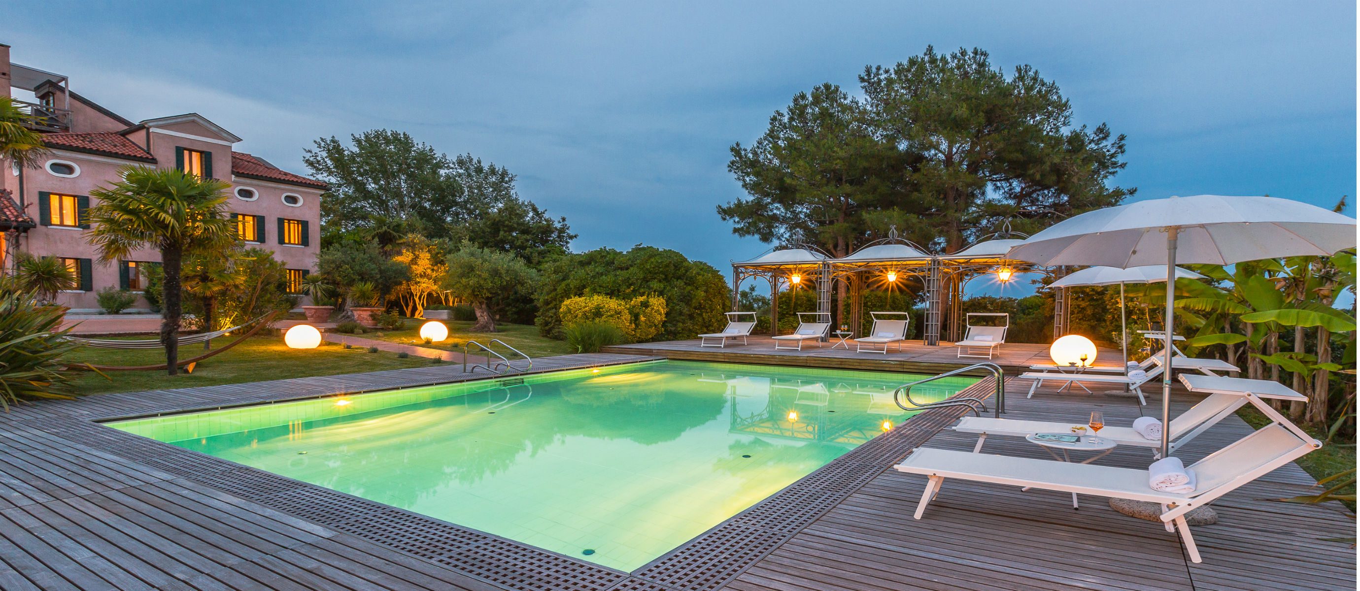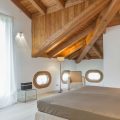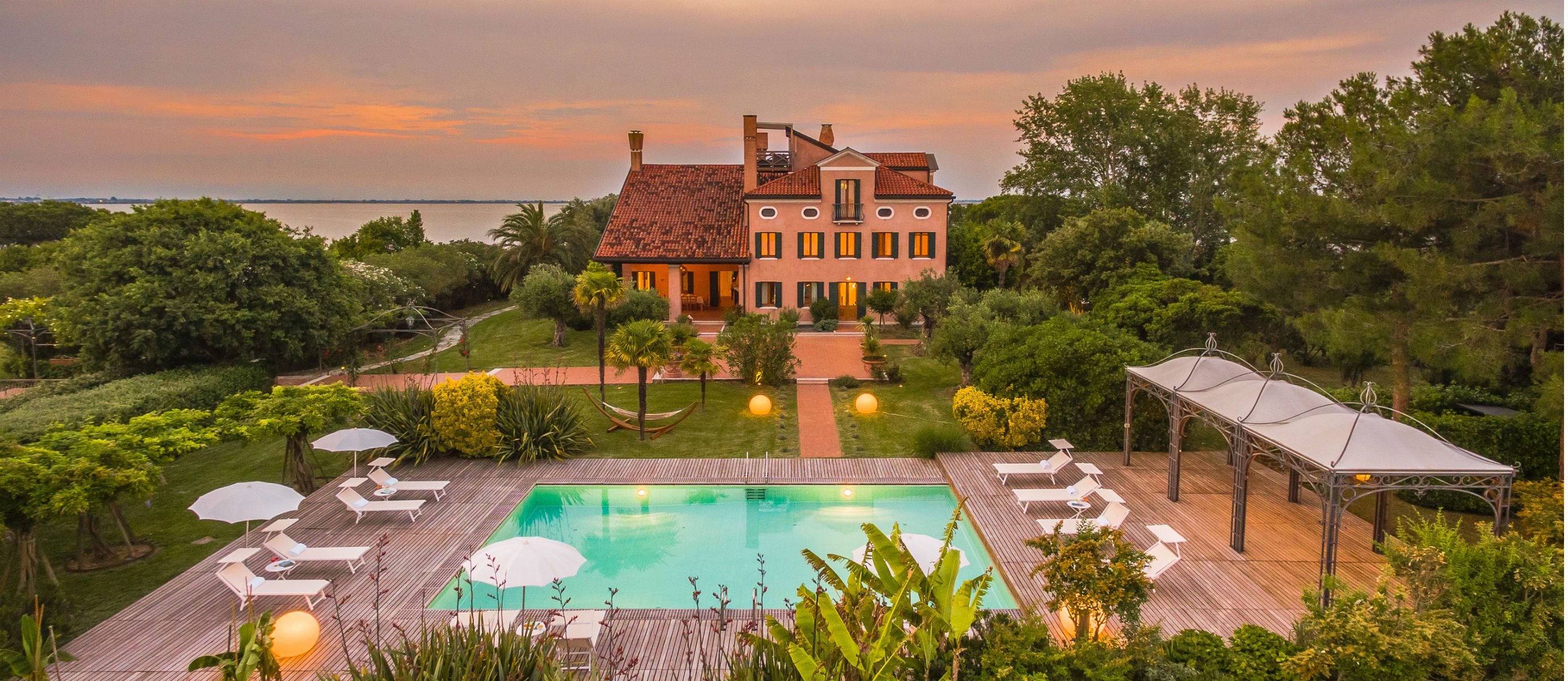 Outside, a spacious terrace is perfect for entertaining, with a large fireplace to set the mood or cook in the open air. A second patio provides a quiet, secluded nook with natural teak dining set, while a typical Venetian rooftop altana offers dramatic views of the lagoon. The villa’s large swimming pool comes complete with stunning teak deck area, gazebo, and lounge chairs.