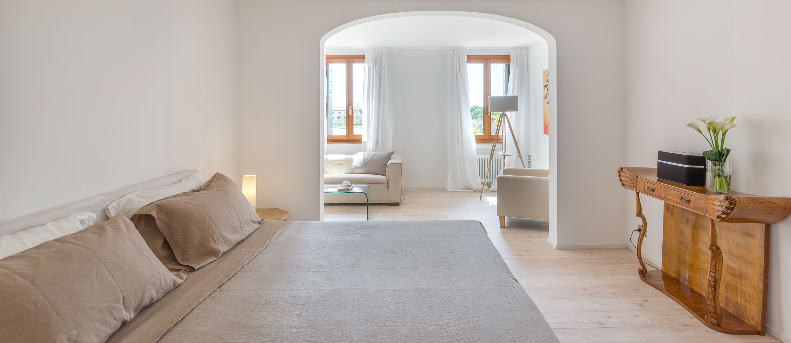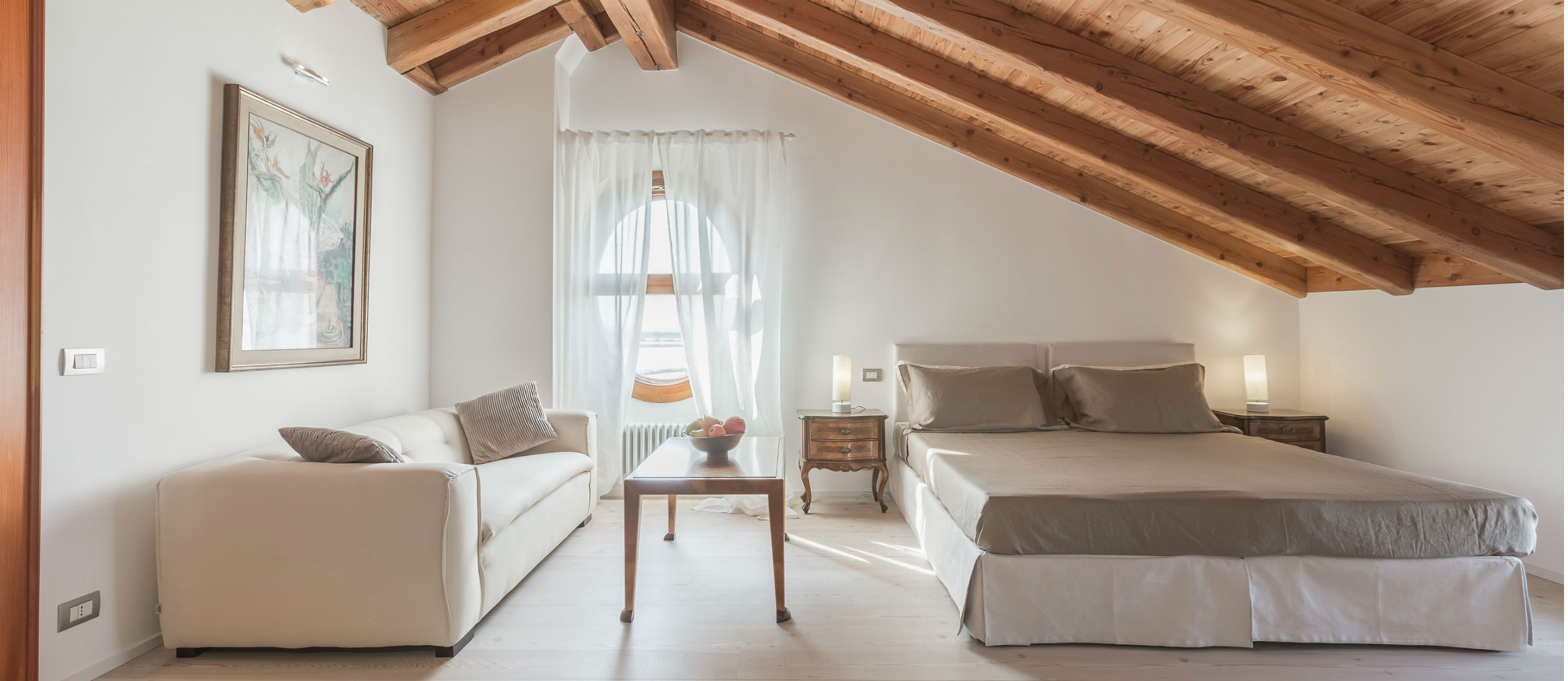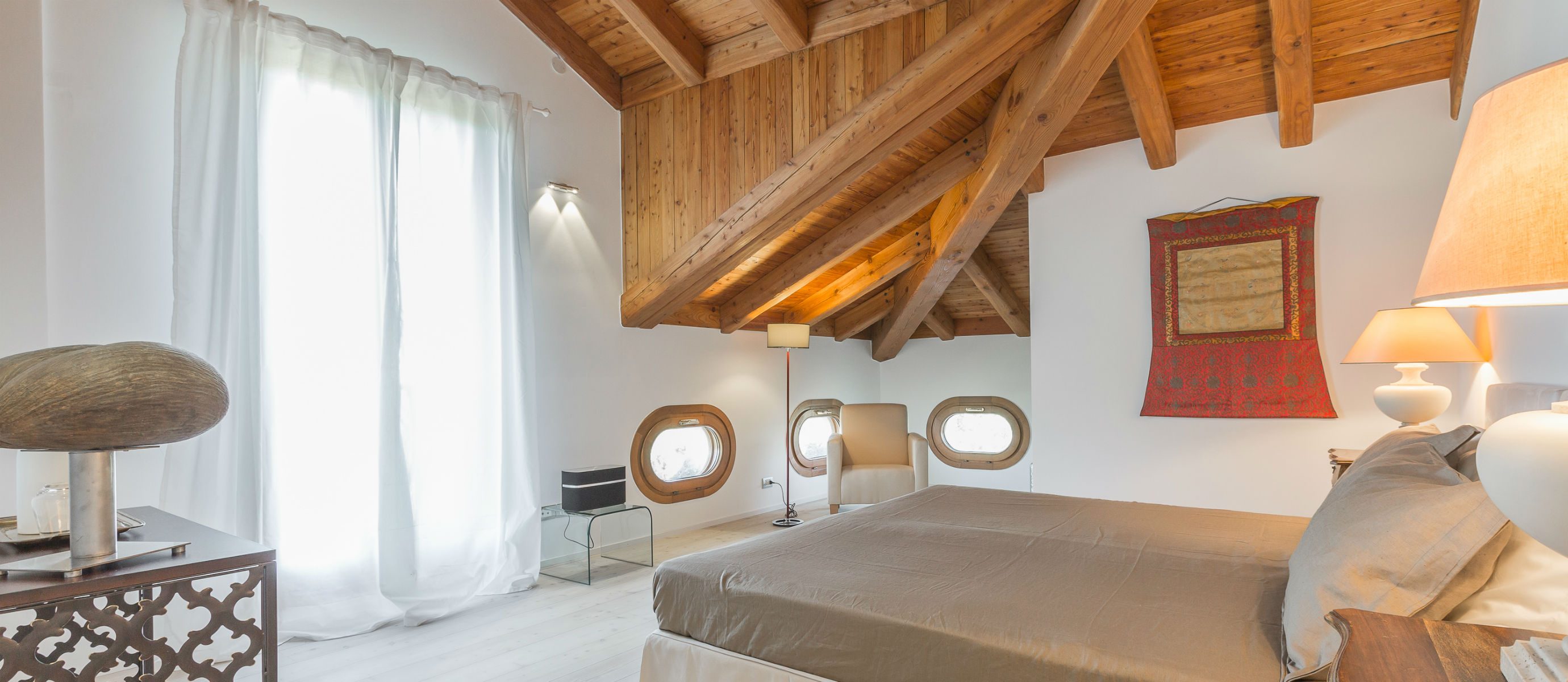 Outside, a spacious terrace is perfect for entertaining, with a large fireplace to set the mood or cook in the open air. A second patio provides a quiet, secluded nook with natural teak dining set, while a typical Venetian rooftop altana offers dramatic views of the lagoon. The villa’s large swimming pool comes complete with stunning teak deck area, gazebo, and lounge chairs.